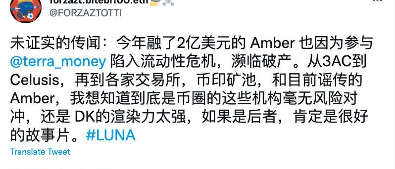 回過頭來看,Amber在今年5月宣布擬以100億美金估值進行新一輪融資,似乎另有隱情。有觀點認認為,Amber在今年2月完成2億美金融資,而三個月后再次尋求融資,且時間點與Luna暴雷幾乎重疊,不排除其當時已發現資金受損,急需外部資金推動公司運營的可能性。