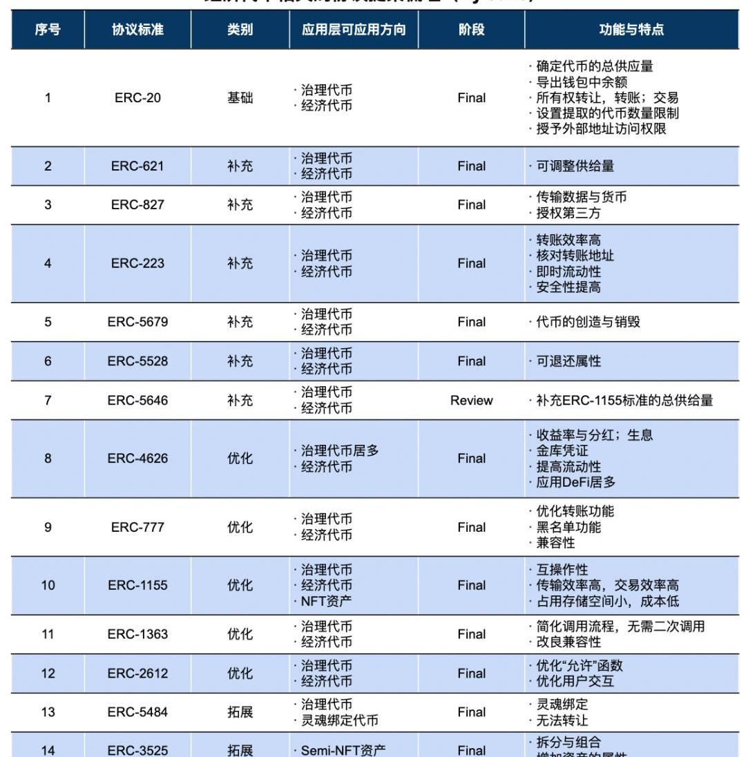 根據以上分析,項目方應考慮選擇代幣的調用與執行標準。截止2022年12月,梳理以下以太坊上經濟代幣與治理代幣相關的協議提案: