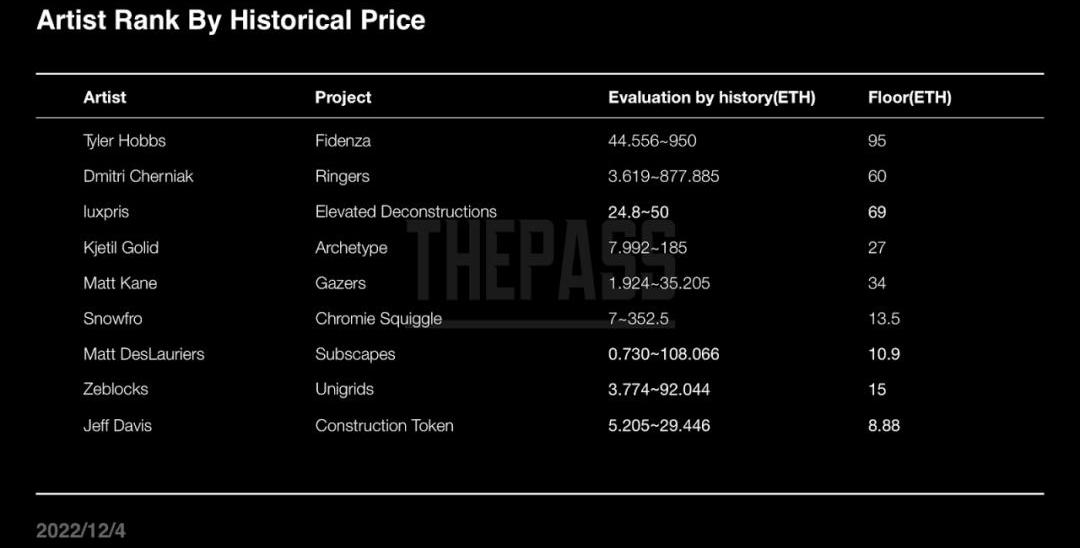 從資產價格評估角度,Curated系列藝術家按照系列地板價排名,前十分別為(2022/12/4):TylerHobbs,luxpris,DmitriCherniak,MattKane,KjetilGolid,Zeblocks,Snowfro,HarveyRayner|patterndotco,MattDesLauriers和DanielCalderonArenas。