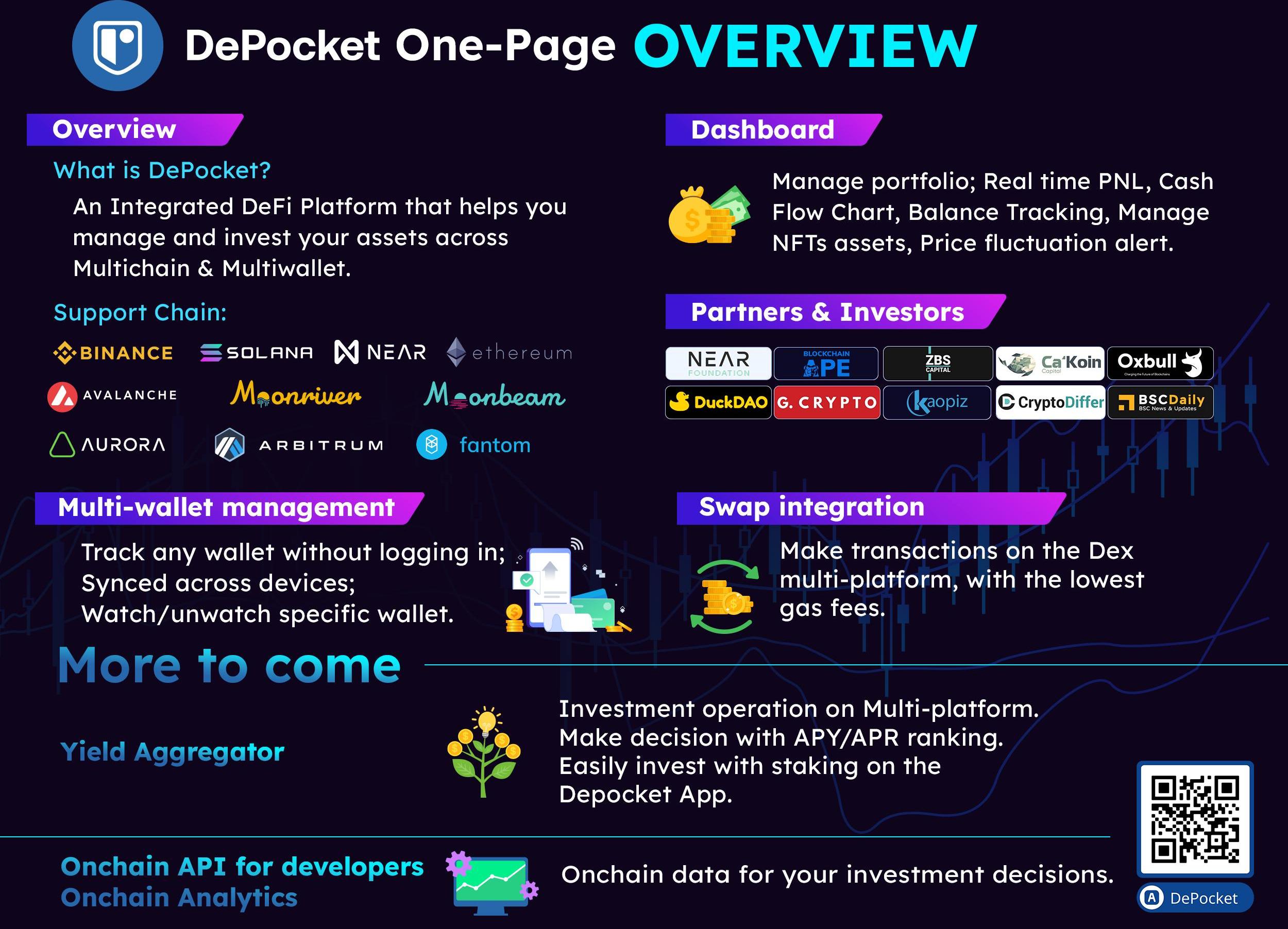 DePocket是一個集成的DeFi平臺,該項目可方便用戶更好的管理和投資跨多鏈、多錢包的資產。DePocket為用戶提供了一站式的可跨多錢包的?DeFi?資管功能和全面的資產儀表板。