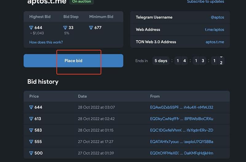 在該界面你可以看見拍賣截止時間、最大和最小出價以及拍賣歷史,之后你就可以點擊“placebid”出價,等待拍賣成功就可以了。