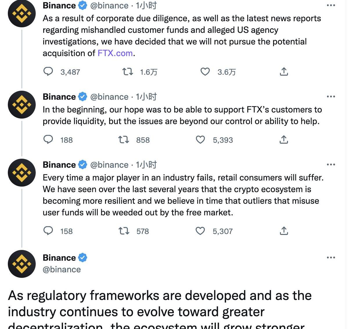 XRP/HKD-5.17%UTC+8時間11月10日早上,幣安官方推特發文表示,幣安已經放棄尋求對FTX的收購。在趙長鵬透露已簽署一份不具約束力的意向書收購FTX后不到一天,幣安就做出了逆轉。