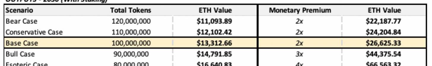 提醒一下,這個基本案例價格預測嚴格基于以太坊核心業務的現金流,即為在其之上構建的一系列應用程序銷售安全區塊空間。