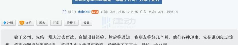 有意思的是,作者在查閱信息時了解到,Crypto.com的CEOKris同時也是一家名為福里斯信息技術公司的CEO。該公司位于深圳,主要負責產品后端的技術開發,其簡介則直接與Crypto.com的描述一致。在求職社區里趴一趴,更是發現該公司口碑褒貶不一,身為CEO的Kris,看上去更像是一個門前站臺的「牌面人物」。