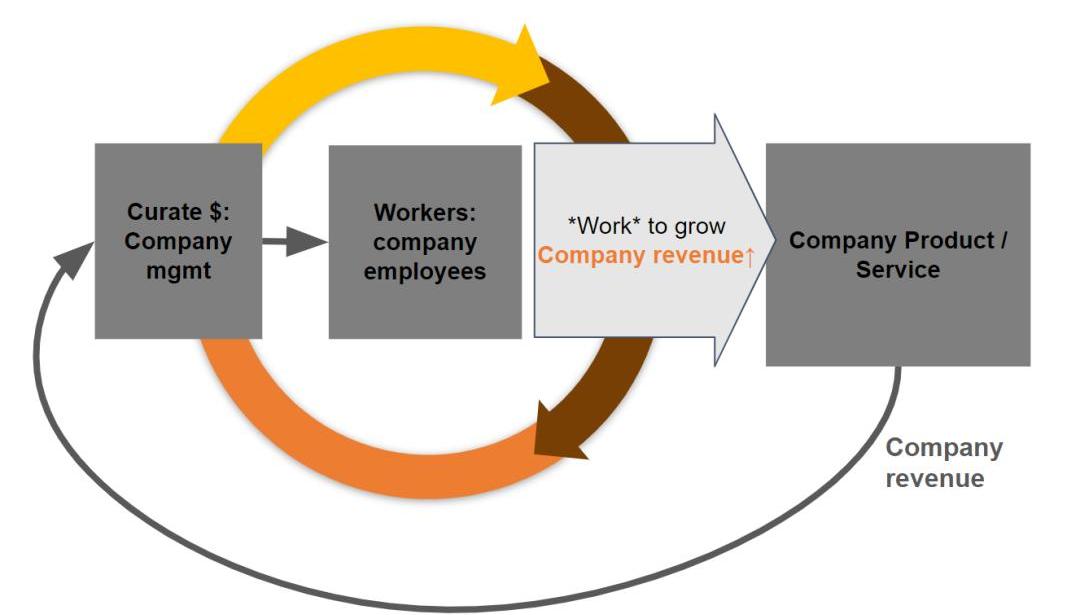 付費訂閱:使用付費訂閱的有軟件服務商和內容服務商等等。交易費用:平臺是向買賣雙方提供服務并向其收取費用的中間人。例如,支付平臺、運輸平臺、住宿平臺、電子商務平臺等等。聯盟營銷計劃:推薦人可以從最終售價中獲得提成。這包括旅行平臺和電子商務平臺。廣告:最大的互聯網業務是廣告中間商。因此,廣告無處不在。在專用搜索平臺、第三方網頁、社交媒體、應用程序和內容創作中都能看到廣告。我們可能討厭廣告,但它們確實為網絡上的可持續業務做出了貢獻。因此,我們可以總結出一點:所有公司都需要一種商業模式來維持自身的生存和發展。從安迪·格羅夫的早餐店生產線、雷·達里奧的原則或杰·福雷斯特的動力系統研究這些來看,商業模式是對商業機器的設計。下圖展示了一類旨在維持和發展的商業機器。工作者處于中心位置:公司員工將公司的產品或服務推向市場,可以增加公司收入。公司的管理層分配公司的收入,以獲得更多資源,推動公司進一步發展。這是一個循環:收入投入到公司增長活動,分配得當,又創造更多收入。