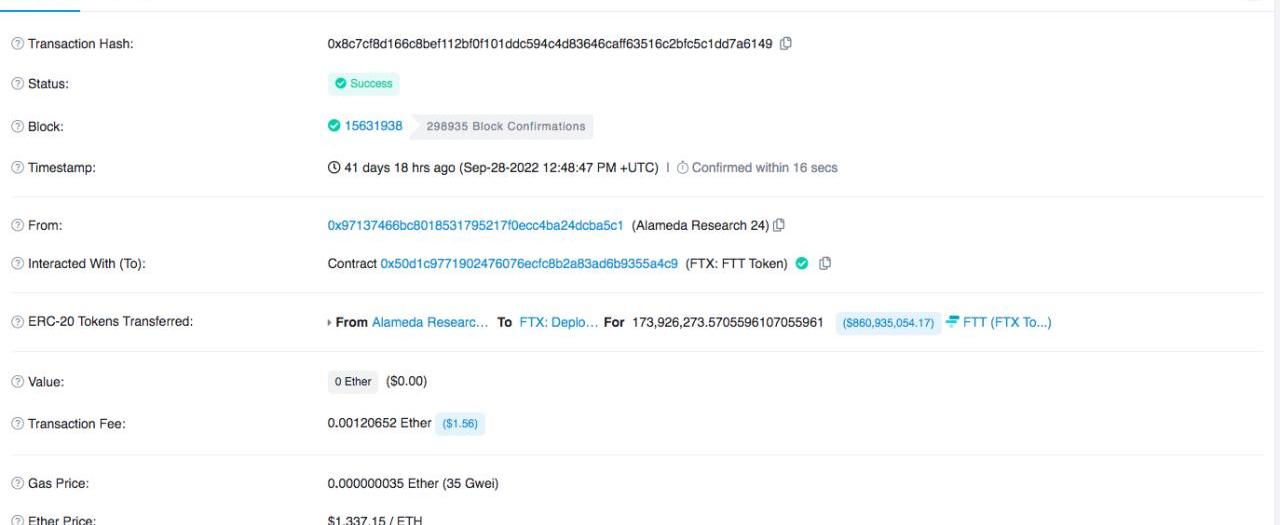 Alameda隨后將“全部的”余額發送到FTTERC20的部署者的地址,該地址由FTX的某人控制。