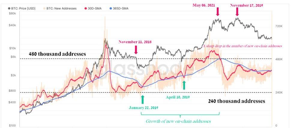 跟蹤和建模加密貨幣市場趨勢變化和比特幣用戶情緒的最有效工具之一是對鏈上活動的分析。新鏈上地址的動態從2021年5月達到的多年高點繼續下降,當時大規模的投資熱潮席卷了幾乎所有市場,新的市場參與者打開錢包,投資“數字黃金”——比特幣。然而,即使在那時,也出現了人們對比特幣興趣下降的第一個信號,新地址的月平均率跌破了365天簡單移動平均線。