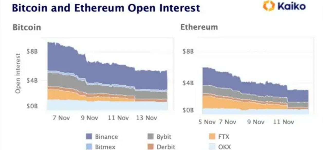 5家交易所的BTC未平倉合約在這一周內從80億美元左右降至55億美元,而ETH從40億美元降至30億美元。FTX的崩潰可能會對衍生品市場產生重大影響,截至11月初,它占BTC未平倉合約總額的14%,占ETH未平倉合約的28%。