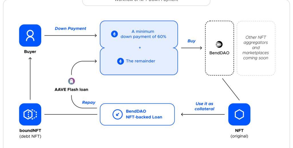 首付買:“首付買”功能的本質亦是原有借貸功能的變種,用戶可以在BendDAO上支付一定首付購買在BendDAO交易市場或其他平臺的的藍籌NFT,其余資金由Aave閃電貸服務提供。相當于Aave的閃電貸功能與用戶首付一起將NFT買下后,買家擁有了NFT的同時在BendDAO協議上進行了抵押借貸,BendDAO的ETH池將貸出的資金歸還Aave閃電貸,其余的利息計算、還款機制、清算機制均基于BendDAO借貸功能。掛單價高于該NFT在協議中的地板價時,首付比例也會相應提高。其工作流程圖如下: