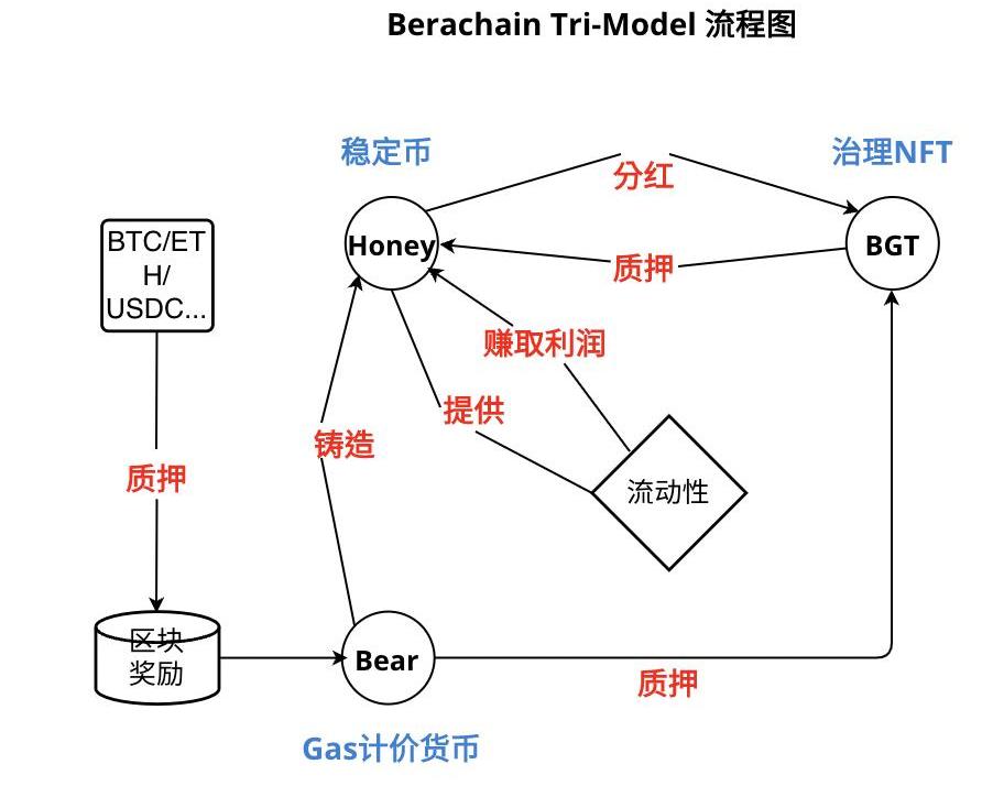 第一步,各種流動性資金(BTC/ETH/USDC等等)通過質押獲得Berachain的區塊獎勵Bear代幣,作為這條鏈的計價貨幣,它有著很直觀的兩個作用:1)選擇鑄造honey穩定幣,參與整條鏈的defi金融行為2)選擇質押,積攢福報兌換用于治理的BGTNFT,此NFT不可交易,但是是一張長期飯票,用于分紅honey穩定幣