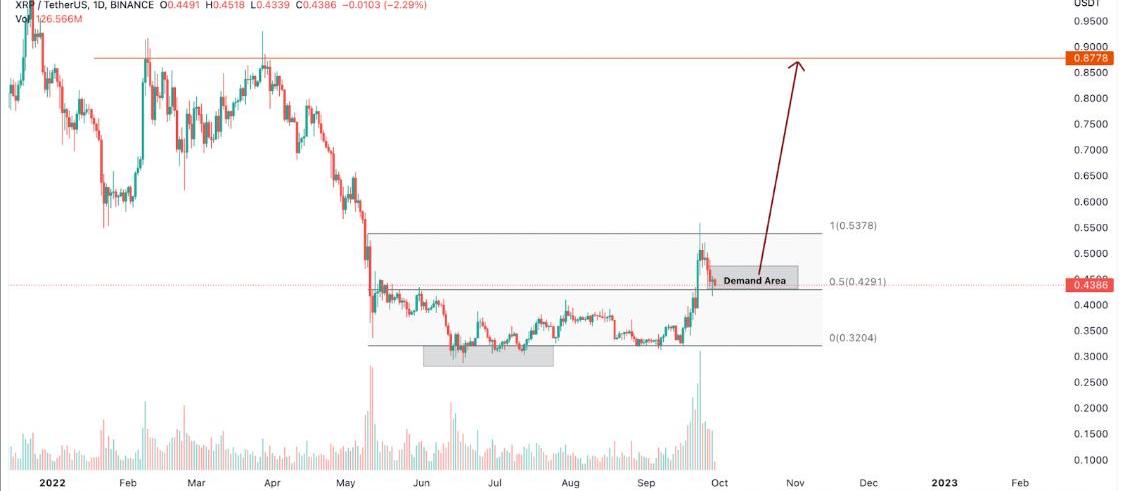 看看如果下降三角形因需求而破裂,XRP可能會去哪里,這很有趣。需求區的價格在5月的第二周開始形成。在0.40美元左右,必須觀察到價格累積。除此之外,可能會觀察到每日時間尺度上的FVG在9月21日達到0.43美元的蠟燭峰值。