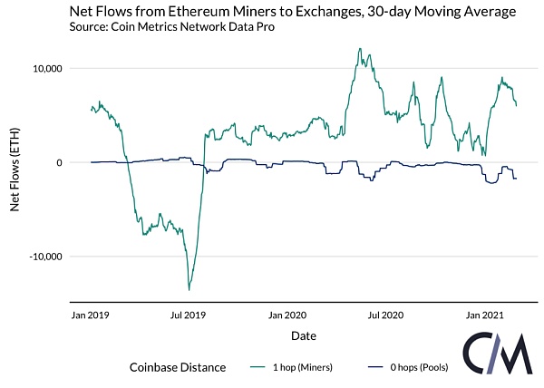 除了觀察礦工持有量外,我們還可以分析進出礦池地址的流量。雖然這些流動在很大程度上是微不足道的,但它們對下一節討論的更廣泛的礦工流動的背景很有用。就像比特幣一樣,以太坊池地址處理的交易量相對較小,流入和流出一般是同步進行的。