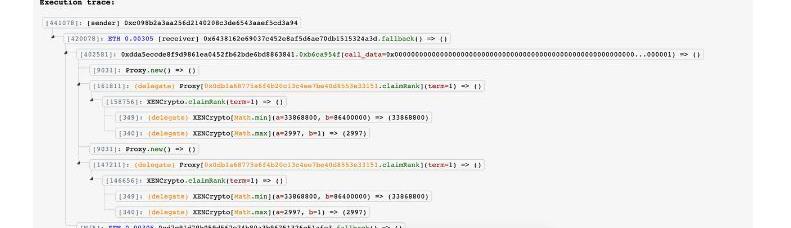 進一步查看交易詳情,每次交易攻擊合約均創建了1~3個子合約,這些子合約先進行XENToken的Mint或Claim。最終這些合約會自我銷毀。這些操作都由FTX熱錢包地址支付gas費。