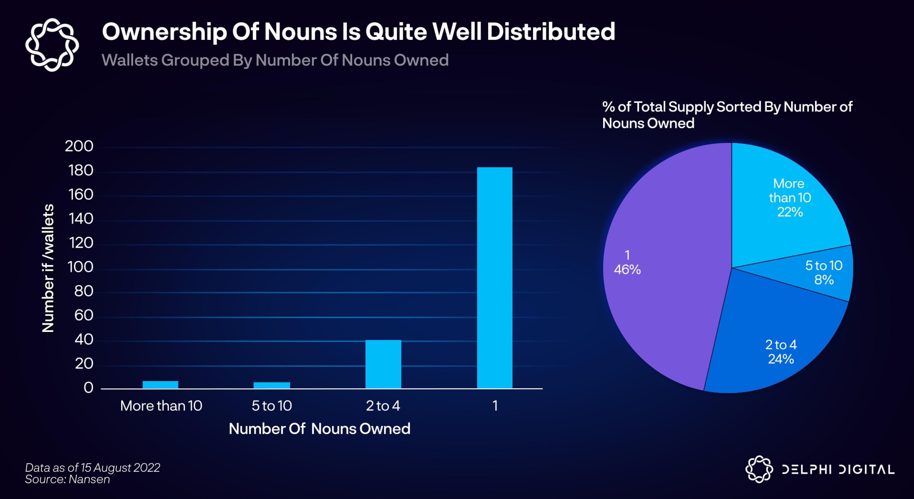 讓我們來看看所有權和投票者結構。如上圖所示,投票權分布良好,幾乎一半的投票權屬于僅持有一個Nouns的持有者。此外,有6個錢包有超過10個Nouns,其中一個是NounsDAO的財庫錢包。如果我們排除這一點,那么只有不到20%的投票權集中在大型'鯨魚'所有者身上。而這正是每日拍賣的影響,該系統會隨著時間的推移稀釋所有權。隨著每日拍賣的繼續,我們預計單一所有者的數量將隨著時間的推移而增加。
