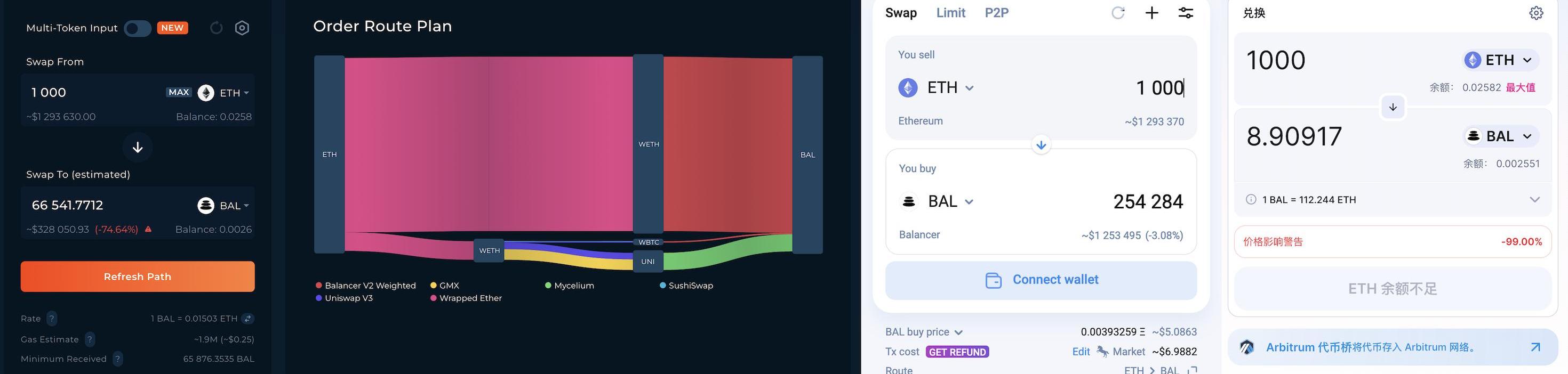 交易缺乏流動性的bal,左為odos結果,中為1inch結果,右為uni結果