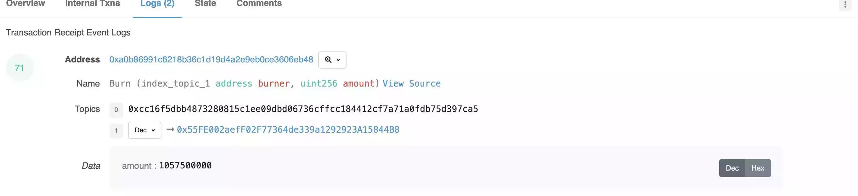 ·Topic1是燒毀函數的一個索引參數。在這里,Topic1是燒毀的Token被發往的地址。(注意:如果燒毀函數有更多的參數,這些參數將作為額外的主題出現)