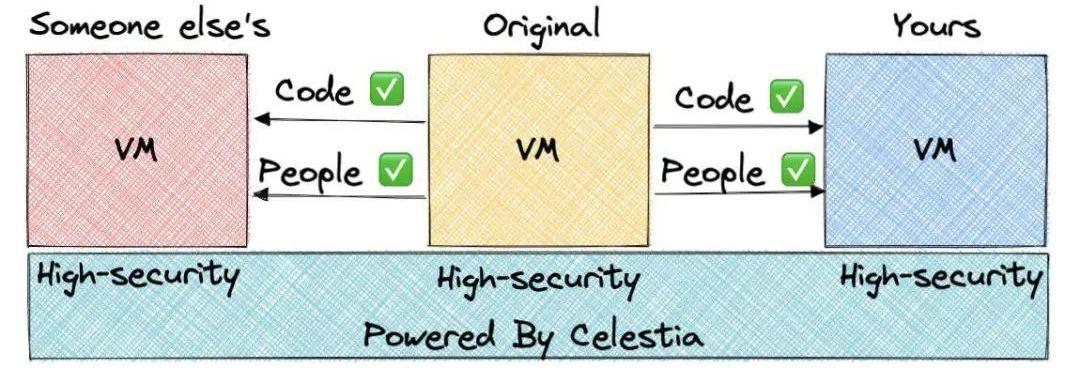 因此,Celestia上的rollups本質上是擁有自己主權的區塊鏈。在L1區塊鏈中,有爭議的硬分叉通常被認為是非常危險的,因為分叉鏈最終會削弱其安全性。因此,通常不惜一切代價避免分叉,從而扼殺創新性。