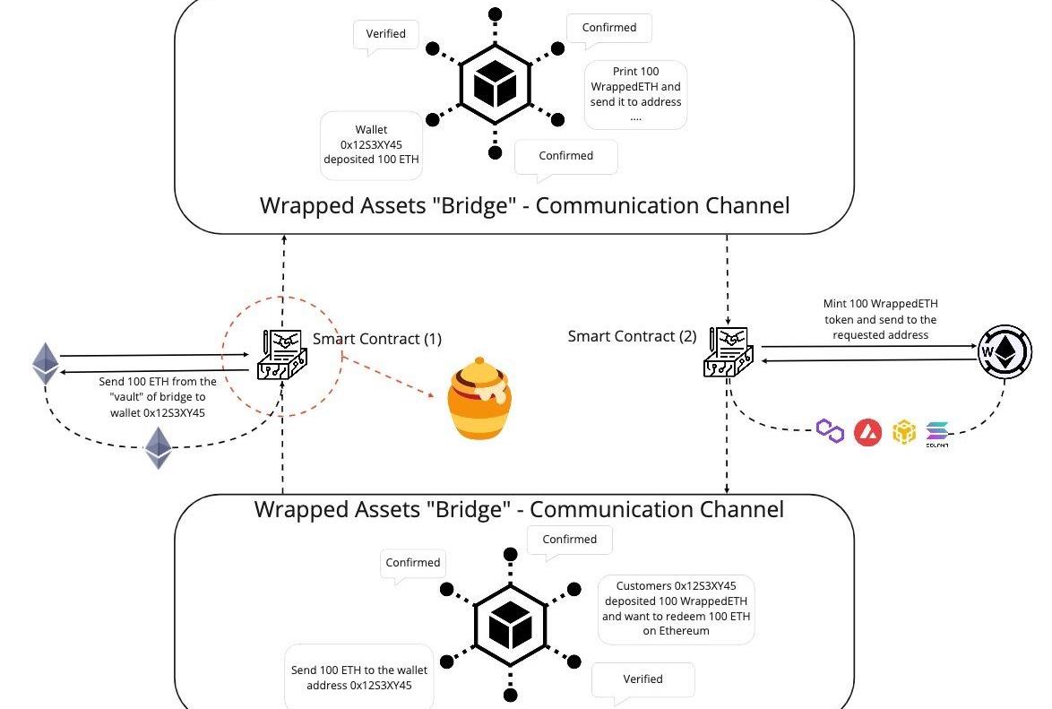 包裹式資產跨鏈機制的流程與上述金本位下的貨幣機制相同,假設你需要將100個原生ETH傳輸到其他網絡,那么包裝資產的項目團隊不僅需要在以太坊上創建智能合約(1),在其目標鏈(如Polygon、Solana或Avalanche)上也要創建一個智能合約(2)。