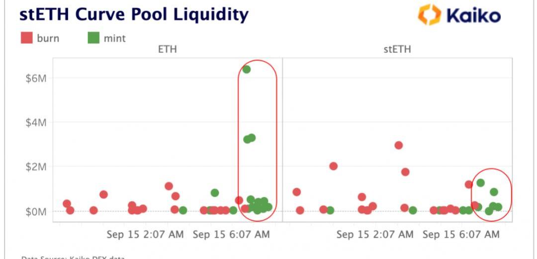 stETH曲線池中流動性提供者的行為變化在合并后顯而易見。添加的兩種代幣的數量顯著增加,特別是對于合并后的ETH。