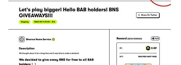 域名服務商BNS公告表示「這次我們玩大的」,只要在幣安交易所綁定錢包并領有BAB的用戶,都能參加活動領取一張「免費鑄造.bsc」的NFT。
