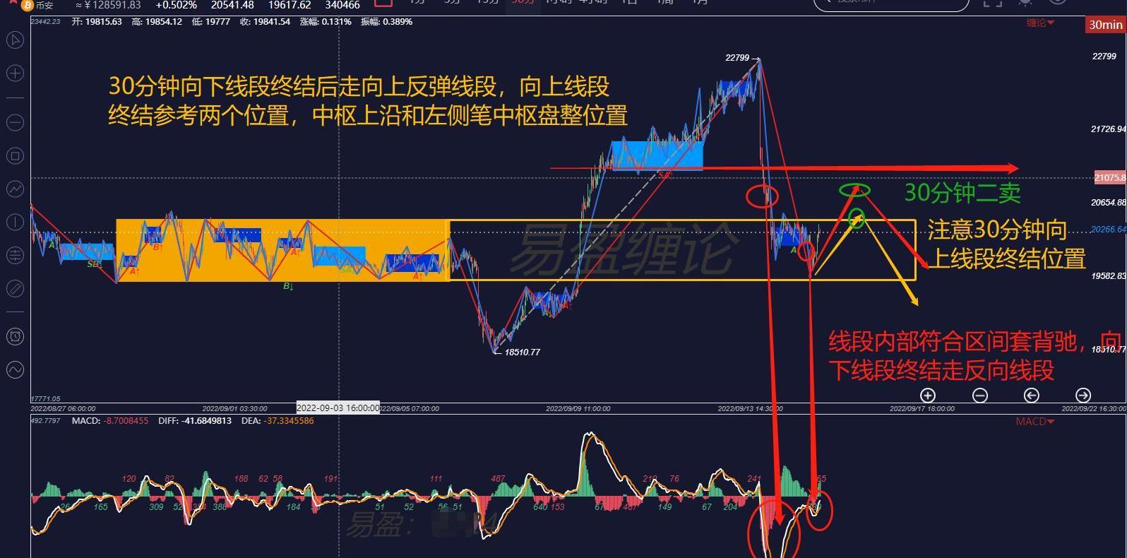 30分鐘圖上看凌晨最低點剛好打到了30分鐘中樞下沿隨后開啟反彈,當前價格已經接近中樞上沿,注意圖中所標注的賣點,從概率上講向上反彈出30分鐘二賣概率大,重點是要看反彈會在哪里終結,先賣后買。當下仍然是30分鐘的中樞震蕩,中樞震蕩戰法應對即可。