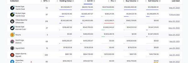 從該表中不難看出,@ApeofPoland擁有高達9個BAYC,其中有兩個自Mint以來沒有賣出。另外,縱觀其所有的投資組合,BAYC的預估計利潤最高,達到$2,061,271.69。