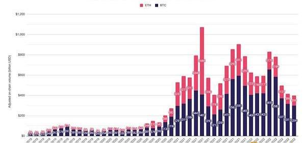 比特幣和以太坊鏈上交易量上,經調整后的總鏈上交易量下降4.2%至3980億美元,其中比特幣鏈上交易量下降5.5%,而以太坊基本持平。