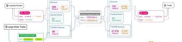 當個體用戶或者協議向Fraxswap提交了一份大額訂單,即長期訂單時,Fraxswap的就會將這些大額訂單分解為無數個無限小的子訂單,然后通過嵌入式TWAMM以均勻的速率消化掉。比如在未來的1,000個區塊里逐步出售100ETH。值得注意的是,如果通過普通的AMM機制來處理這些單獨的子訂單,需要花費大量的Gas成本,但Fraxswap的嵌入式模型有效地避免了這一缺陷。