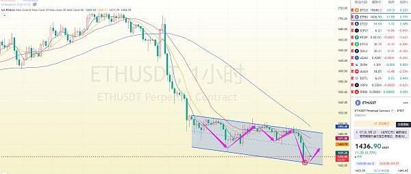 BTC從1小時圖看,近期來看,市場開始了緩跌走勢,并沿新的通道進行規律性下落。此時通道下沿位置支撐較強,可以考慮通道下沿附近做多的思路。