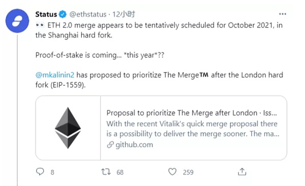 關于ETH2.0的進程,根據Status最新報道,ETH2.0合并可能會在2021年10月份的“上海硬分叉”升級中實現,也就是說,以太坊轉為PoS將在今年之內實現。Github上正在進行的討論表明,“上海硬分叉”將特別解決2.0合并問題,而不是普通的功能分叉。