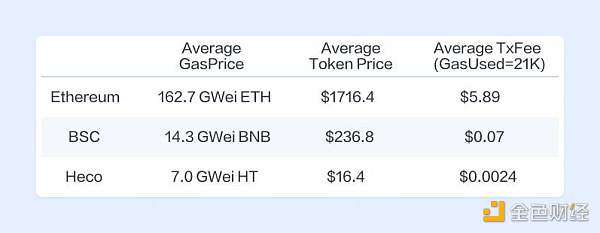 通過粗略地統計三條鏈在同一時間段 500 條交易內簡單轉賬交易的數量我們可以驗證這一點(Ethereum 106 筆,BSC17 筆,Heco7 筆)。