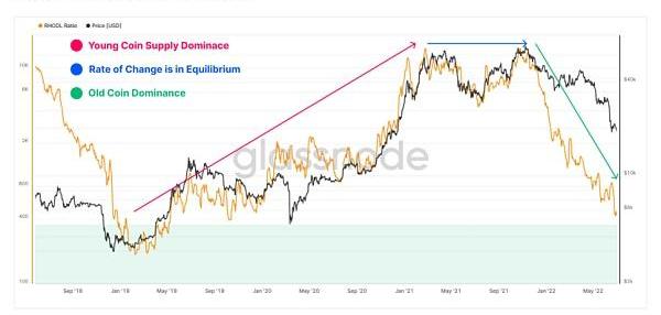 穩定的RHODL比率表明新舊主導權之間的變化率處于平衡狀態。這是一個過渡時期。通常在市場過渡時期觀察到,如分配市場頂部和積累底部。