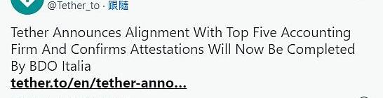 XRP/HKD-5.28%穩定幣USDT發行商Tether宣布和全世界第五大會計師事務所BDO?進行合作,未來會負責審計該公司的儲備金保證與證明報告。該公司并且預告其未來的審計報告將會從每季一次改變成每月發布。
