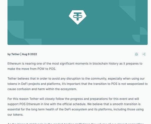 USDT發行方Tether表明僅支持PoS版本以太坊