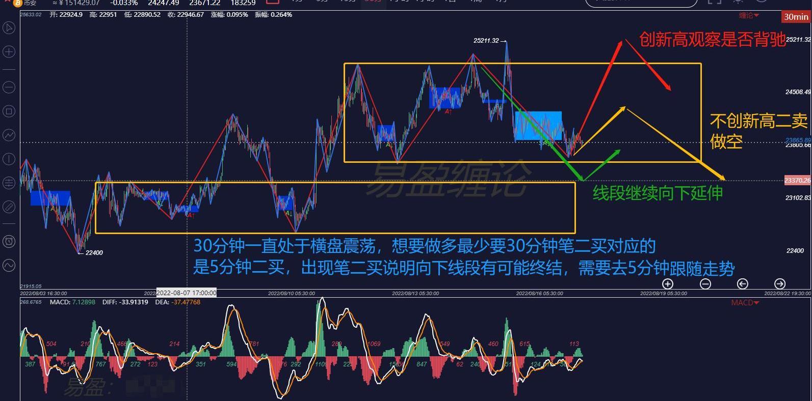30分鐘圖看由于一直橫盤震蕩,走勢分類跟昨天沒什么區間。當然想要做多,必須等待30分鐘出現筆二買對應就是5分鐘二買。