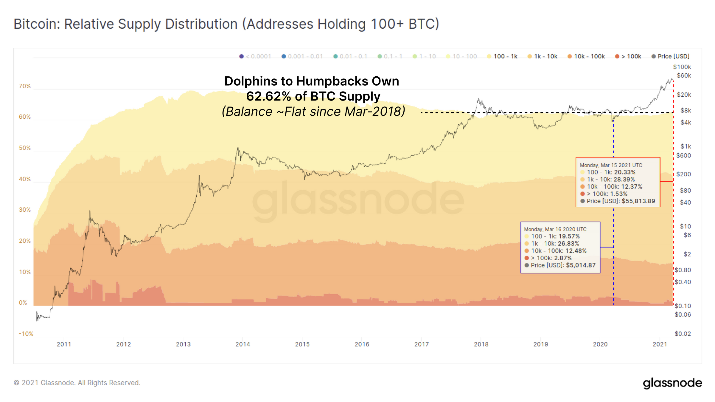 有趣的是,盡管我們繼續看到散戶在積累BTC,但在過去三年中,大錢包(>100BTC)的持倉量相對沒有太多變化,下圖顯示了余額在100 BTC及以上地址的比特幣持有供應,這類錢包地址目前總共持有的BTC數量占到了總供應量的62.62%,并且在過去12個月內增加了0.87%的百分比。