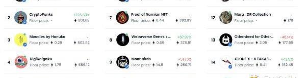 該榜單羅列了近期較有熱度的15個項目。從最新的榜單我們可以發現,大多數都是老面孔或者老面孔的衍生品,陌生的面孔和字眼屈指可數。這不僅意味著項目方缺乏推陳出新的動力,還意味著投資者對于層出不窮的NFT項目已經幾乎沒了fomo的激情。