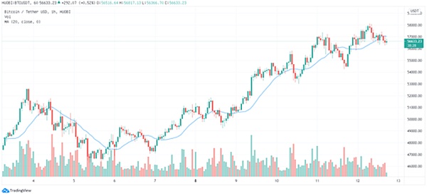 根據火幣交易平臺數據顯示,BTC早間在60000一線震蕩橫盤,隨后日內空方發力大幅下跌,目前最低至54550.00USDT,成交量有明顯放大。一小時級別來看,BTC在昨日達到歷史高點后持續高位縮量橫盤,期間空方嘗試下探,在59000一線得到了支撐,隨后再次下探并跌破支撐位,目前跌至前期震蕩區間的下沿位置。日線級別來看,BTC迎來兩連陰,回到了前期漲幅的2/3位置。晚間持續關注下跌行情的延續情況以及下方53400的支撐情況。