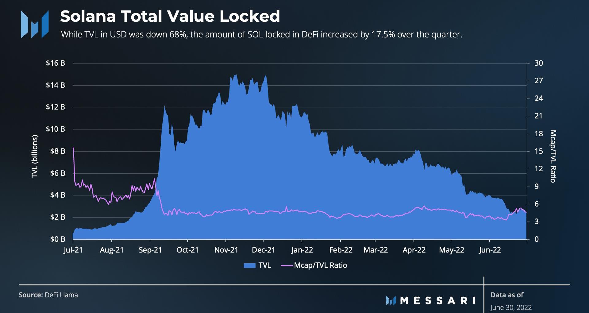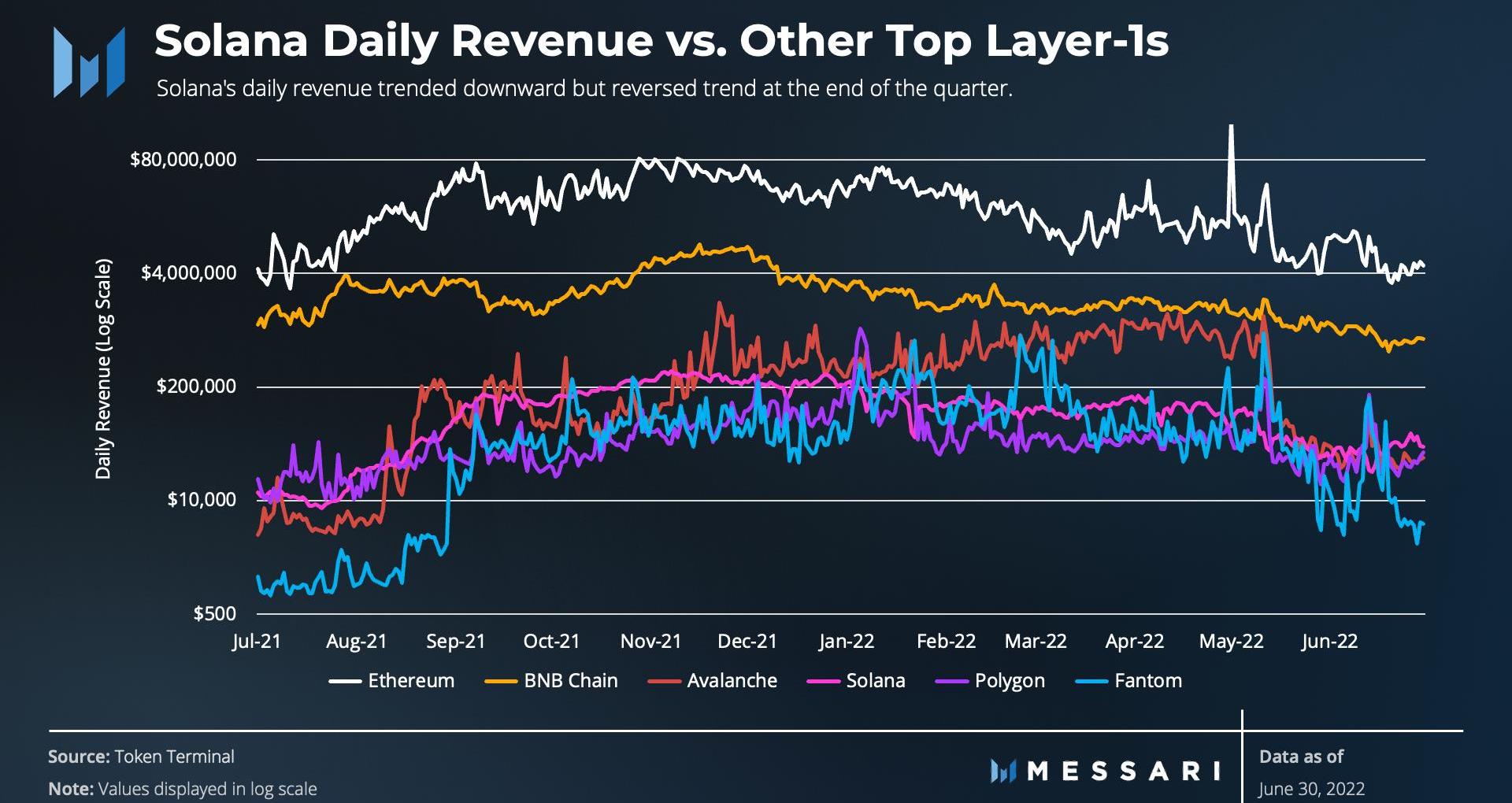 最終,隨著第1層網絡活動在整個領域中急劇下降,第二季度開始出現混亂。鷹派貨幣政策以及600億美元的terraUSD(UST)和LUNA崩盤等宏觀力量使市場陷入混亂。與大多數網絡一樣,Solana也受到了宏觀經濟環境的影響,因為我們看到財務和網絡使用指標下降。